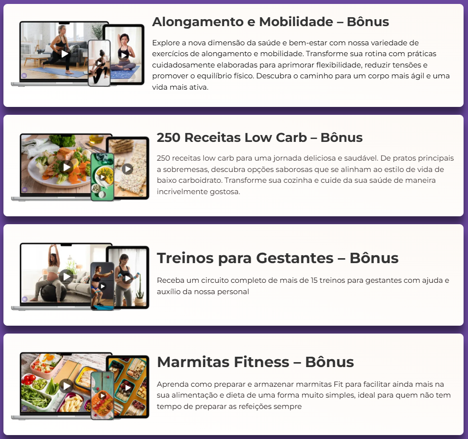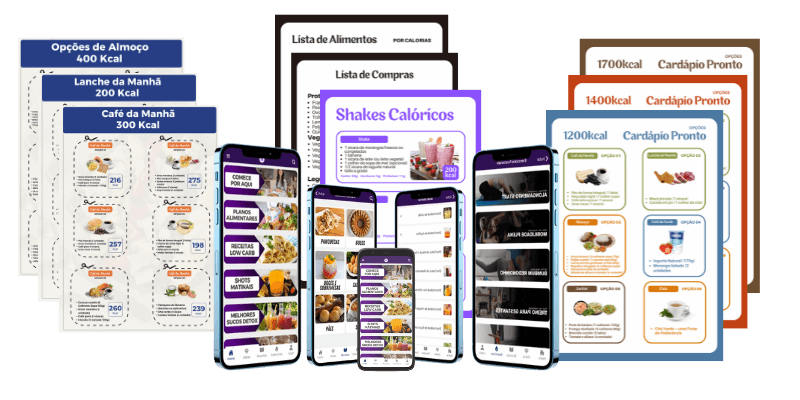 Além do nosso aplicativo super completo você ainda receberá diversas opções de Refeições, Cardápios, Listas de Compras, Alimentos e Calorias e muito mais, tudo pronto e organizado por calorias, tudo prático para imprimir e seguir sua dieta mais facilmente.